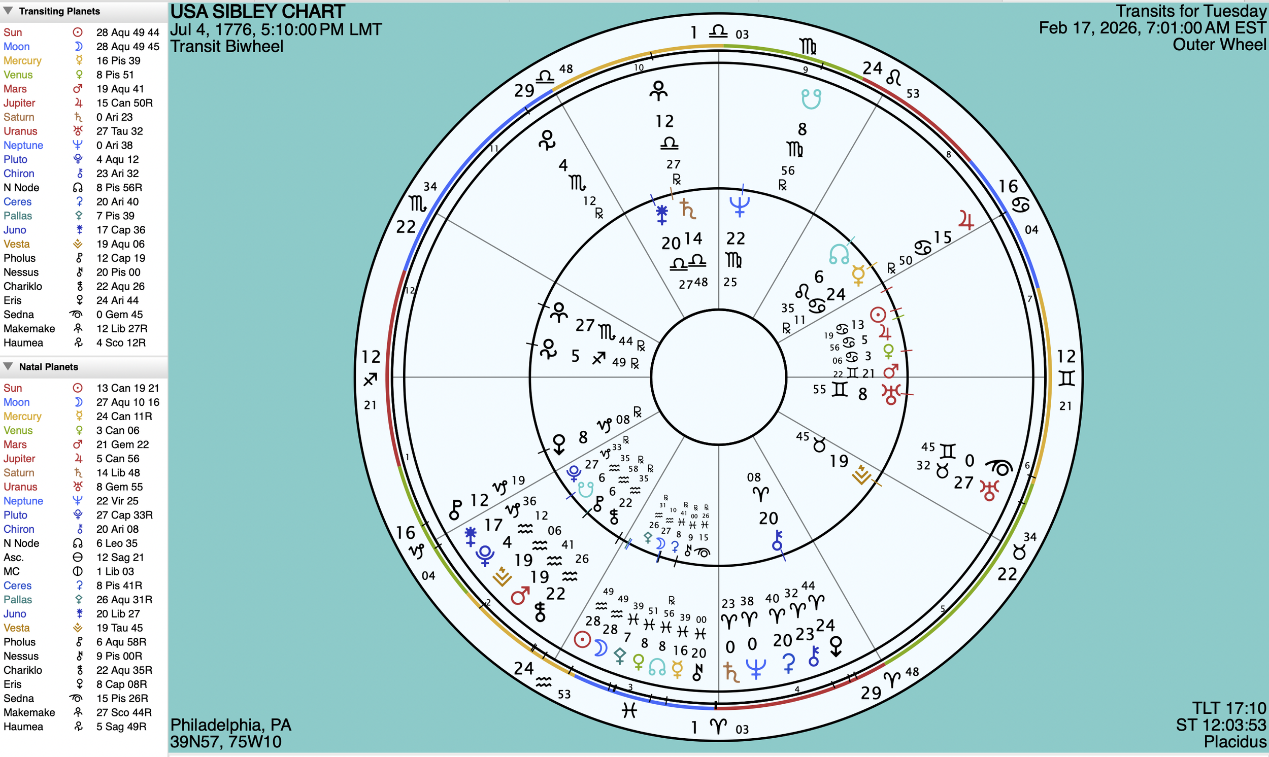February 2026: the chart of the North Node Solar Eclipse in Aquarius conjunct the US Sibley chart Moon